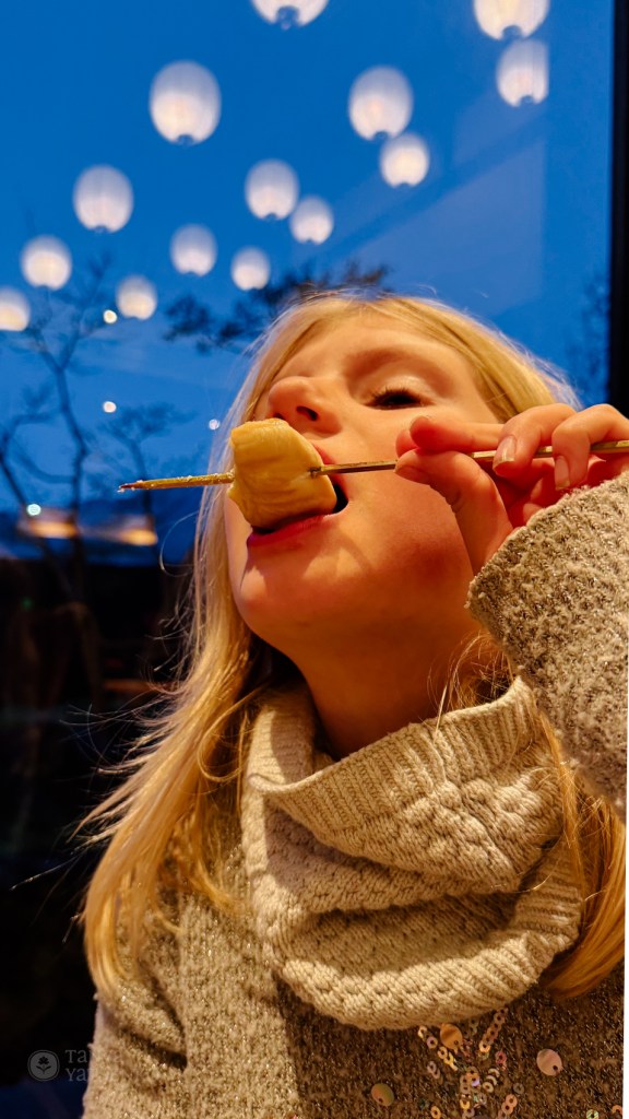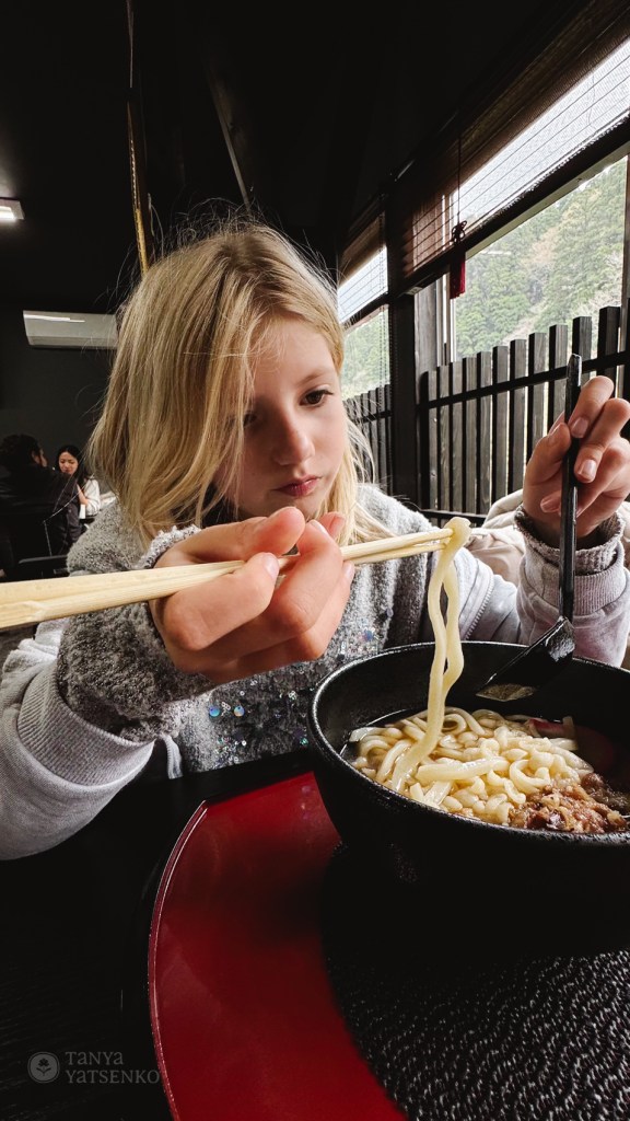 The ferry ride took one hour. There wasn’t much to buy on board, so the kids were a bit hungry. In the end, I bought KitKats and onigiri—at least something!