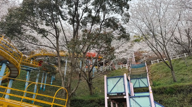 And you know what?! It was the best playground ever—even for adults! 😅 I couldn’t resist and went down two slides myself. The cherry trees were in full bloom, and we were surrounded by falling sakura petals—it felt like a dream. The park was almost empty, except for one Japanese family having lunch under the cherry blossoms.