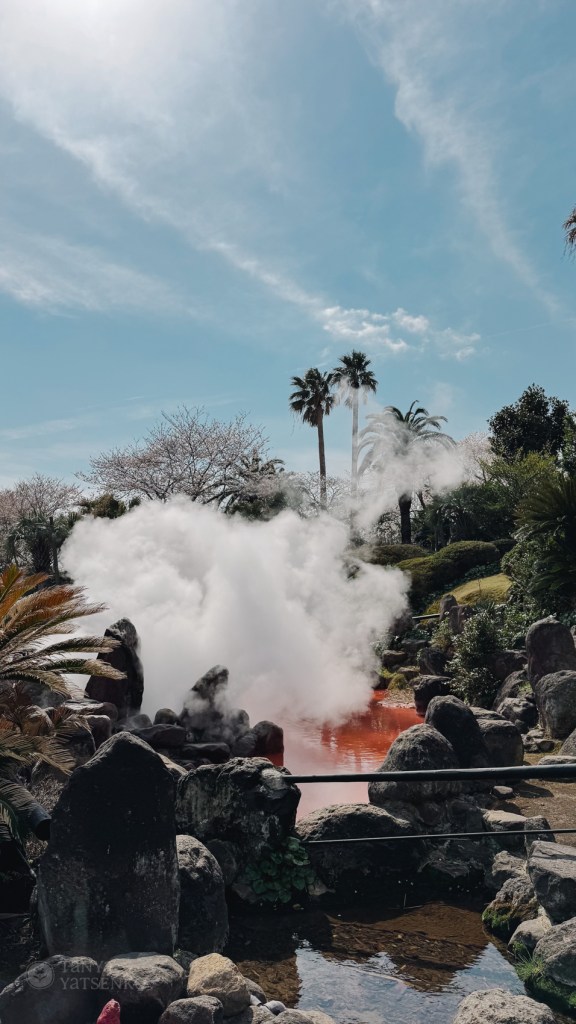 Route:Beppu → Yufuin Morning visits to the Hells of Beppu (Jigoku) felt surreal — steaming blue and red pools surrounded by palms and cherry trees. After lunch, we drove to Yufuin, a small mountain town full of cafés, handmade shops, and onsens.