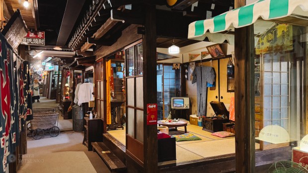 These summer kimonos (yukatas) were provided by the hotel. Actually, there was a shelf stand with different colors and sizes available. This hotel follows a ryokan style, which means you have access to the onsen—hot bathtubs, both indoors and outdoors.