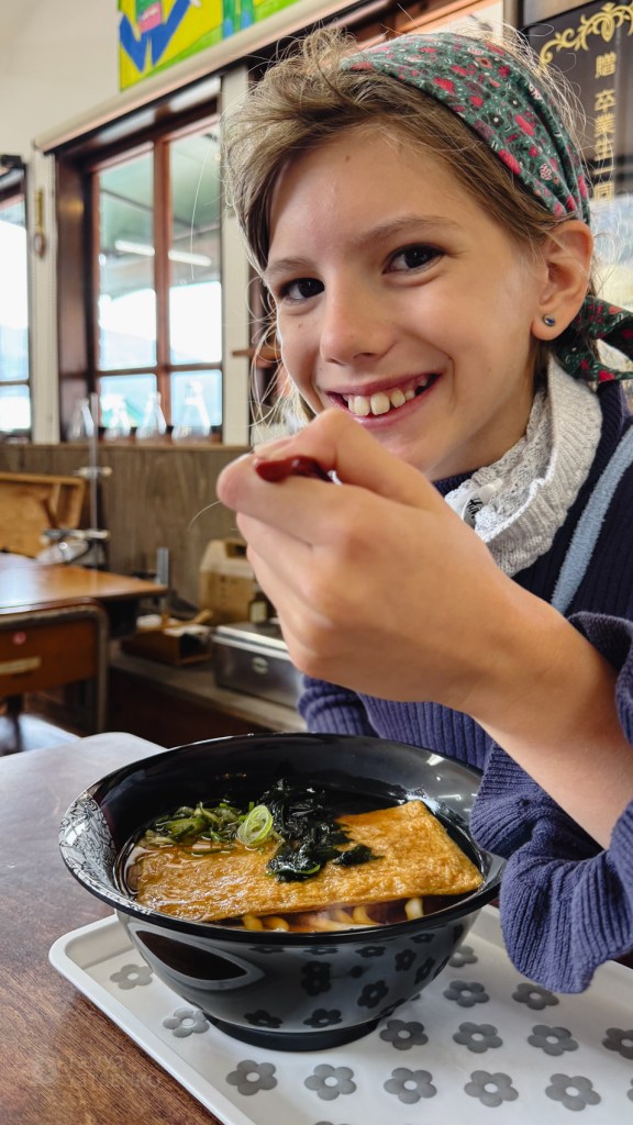 I remembered a small udon place by the lake, so we headed straight there. To my surprise, it wasn’t too busy. We waited just a little inside while the girls fed some nearby deer with crackers we purchased at the same place.