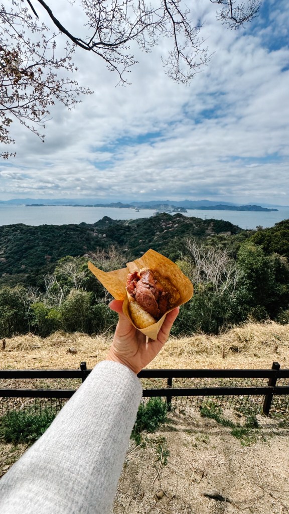 By evening, we arrived in Onomichi town, staying in a 100-year-old wooden house with sliding doors and creaking floors. Dinner was simple — Onomichi ramen and gyoza in a local shop. We visited a Lawson convenience store and bought different Japanese snacks and sweet for breakfast.