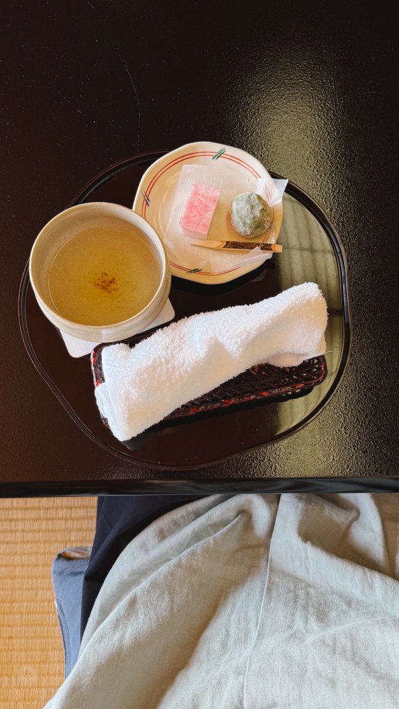 It was also the first hotel in Japan where we had to take off our shoes immediately upon entering the building. So basically, everyone was walking around barefoot or in socks throughout the hotel. A tea ceremony was being served while we checked in, and afterward, we were shown to our room. There, we were greeted with local sweets and a pot of hot tea.