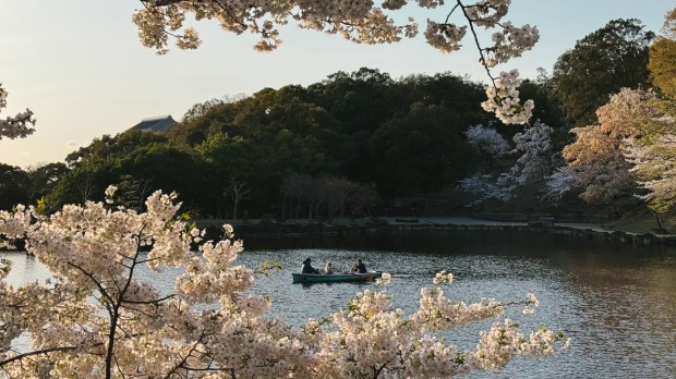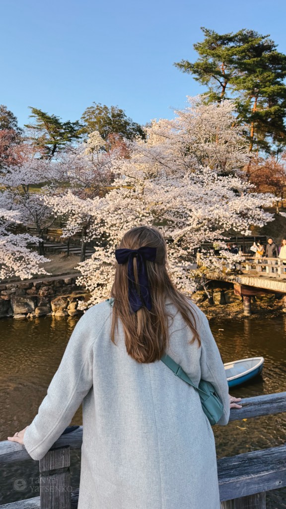 It turned out to be a spot filled with cherry trees in full bloom. Japanese people had gathered there for hanami, the tradition of enjoying a meal with friends under the sakura blossoms. The paper lanterns hanging everywhere gave the place a magical atmosphere. I hadn’t expected to experience such beauty! In Kyoto or Tokyo, it would have been impossible to enter due to the crowds, but here, the park was peaceful.