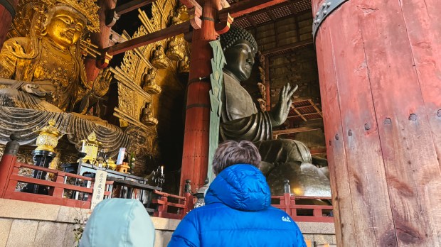 Route: Nara → Kansai Airport We woke up early for one last walk in Nara before the crowds arrived. We visited Tōdai-ji Temple, where our family squeezed through the “Buddha’s nostril” for good luck.